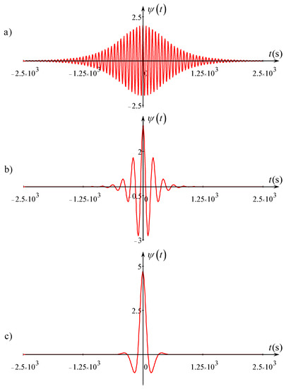 If we assume that an NLS soliton of Equation (10) has the initial amplitude m and velocity m/s, then we obtain that its characteristic duration is: s min. The soliton chirp Equation (11) at is 1/s and the corresponding carrier wave period is s. This means that there are carrier wave periods on the half-duration of envelope soliton (see Frame (a) in Figure 3).