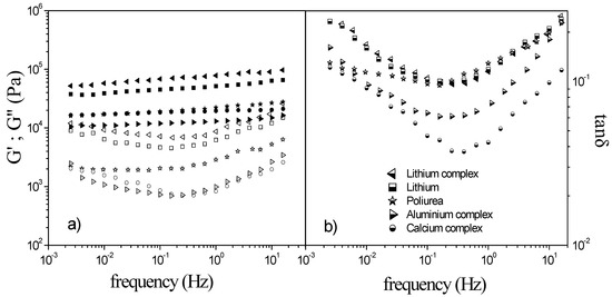 Frequency dependence of the storage and loss moduli (a) and tan δ (b), in the linear viscoelasticity region, for the five lubricating greases studied (filled symbols, G’; empty symbol, G’’).