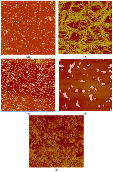 AFM photomicrographs for the five different lubricating greases studied (window size corresponds to 20 μm): (a) aluminum complex, (b) lithium, (c) lithium complex, (d) calcium complex, and (e) polyurea * greases (* window size corresponds to 5 μm).