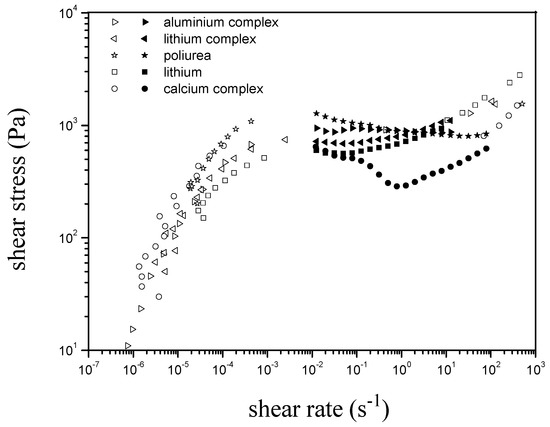 Special attention has been paid to the steady-state flow behaviour of lubricating greases because of the complex strain response to stress and the time-dependent behaviour exhibited [3,4,5,6,7,8,9]. It is accepted that lubricating greases are yielding materials, characterized by a discontinuity in the flow curve, particularly in the yielding stress range, where the deformation process is characterized by a sudden drop in viscosity when the shear stress slightly increases. The existence of three different regions in the viscous flow curve of lubricating greases has been previously discussed [6,7,8,9,10]: firstly, a tendency to reach a limiting viscosity, at very low stress values; secondly, a dramatic drop in viscosity; and finally, a tendency to reach a constant high-shear stress–limiting viscosity. The appropriate characterization of this flow behaviour has an evident practical importance, above all in relation to average life-time, resistance under operating conditions, and pumpability [2]. Indeed, this characteristic flow behaviour allows the “practical” yield stress value to be determined, which plays an important role in the design of automatic grease centralized pumping and distribution systems [5].