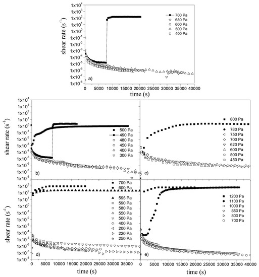As can be observed in Figure 5, creep experiments evidence different transient responses, depending on the type of grease. All greases reveal a noticeable jump of the shear rate at a given value of shear stress, which again is indicative of the yielding behaviour of these materials. In addition, it is worth pointing out that for aluminum complex, lithium, and polyurea greases, the shear rate may increase suddenly and sharply from a zero-near value to a high-shear rate value in the same test after a certain shearing time. This fact is appreciated at 700, 490, and 1100 Pa, respectively, which roughly correspond to the apparent yield stress values, i.e., the stress values for which a sudden jump in shear rate was observed in the stepped-stress ramps obtained in the CS mode. Coussot et al. [38] observed a similar phenomenon with a bentonite-water mixture, which was described as “heavy creep instability”. This fact could be associated with the well-known shear banding effect, for which different values of shear rate can coexist for the same shear stress value applied [10,28,31]. Thus, at very low shear stress, the material behaves as a stiff material; however, when grease starts to flow, it seems to do so heterogeneously, and the shear banding phenomenon finally promotes the fracture of the sample.