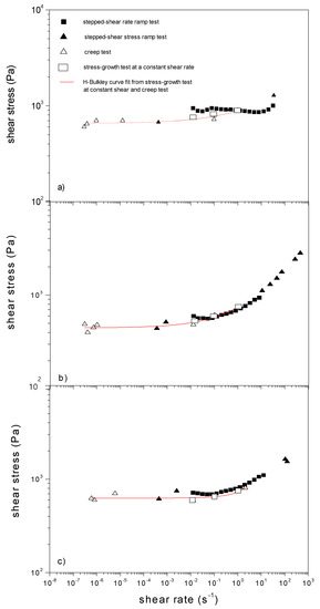 In all cases, the Herschel-Bulkley model (Equation (2)) has been used to fit these corrected steady-state flow curves: