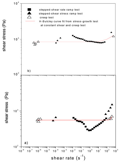 - Møller, P.C.F.; Mewis, J.; Bonn, D. Yield stress and thixotropy: On the difficulty of measuring yield stresses in practice. Soft Matter 2006, 2, 274–283. [Google Scholar] [CrossRef]
