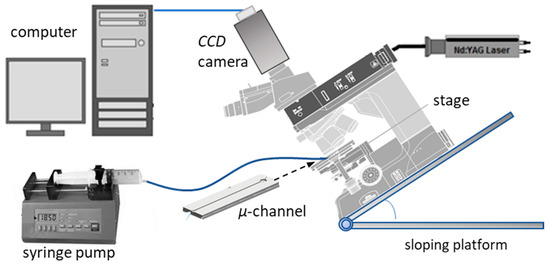 The experimental setup (Figure 1) comprises the test section, i.e., the open microchannel, which is connected to a syringe pump (AL-2000, World Precision Instruments®, Sarasota, FL, USA) to feed the liquid and the μ-PIV system. The μ-PIV system used consists of a high sensitivity charge-coupled device (CCD) camera (Hisense MkII, Dantec Dynamics®, Skovlunde, Denmark), which is connected to a microscope (Nikon Eclipse LV150, Nikon Corporation®, Tokyo, Japan), while the acquired images were processed by the Flow Manager Software (Dantec Dynamics, v4.00). Prior to measurements the fluids were traced by adding Nile red fluorescent carboxylate microspheres (Invitrogen, Carlsbad, MA, USA) with mean diameter of 1 μm. The measurements were conducted 30 diameters downstream from the inlet of the microchannel, where fully developed flow is established. The test section was placed on the microscope stage, which can be moved along its vertical axis with ten-micron accuracy. To obtain sufficiently magnified images a 20× air immersion objective with numerical aperture (NA) equal to 0.45 was used, which results in 3 μm depth of field. The maximum recording frame rate of the camera is 12.2 fps and that restricts the maximum frequency of the measurements to 12 Hz. The field of view was covering the whole channel width.