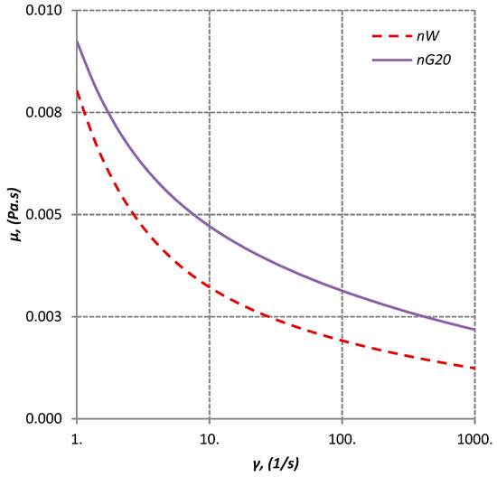 where, , is the yield stress, K, the viscosity consistency and n, the power law index. The physical properties of the fluids are shown in Table 1, while, for the liquids employed, Figure 3 presents the dependence of viscosity on shear rate.