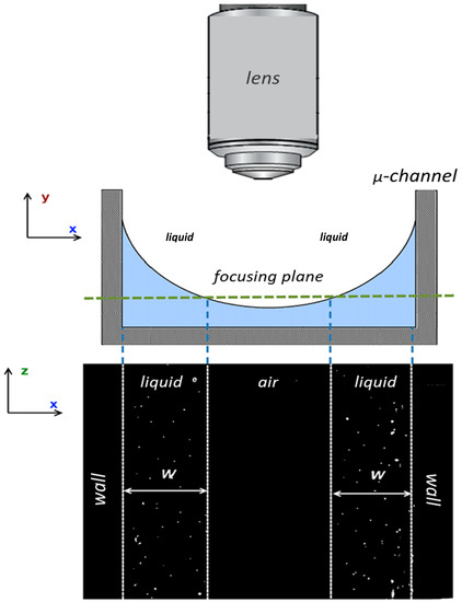 As already mentioned at the experimental set-up section, μ-PIV measurements require the injection of fluorescent tracing particles into the fluid. Consequently, in each focusing plane, the liquid phase corresponds to areas where light spots are visible, the external dark areas are identified as the walls of the microchannel, whereas the inner dark area corresponds to the gas phase (Figure 4). The use of proper microscope objectives ensures a narrow depth of field, which in turn increases the measuring accuracy, since the focus plane can be moved with a steady step of 10–20 μm resulting in to the recording of 20–25 planes per measurement.