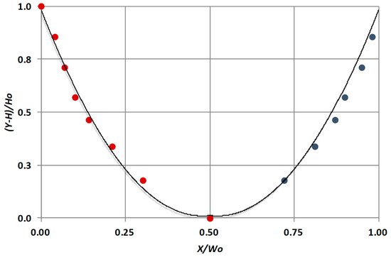 Figure 10 presents the variation the meniscus height over the substrate divided by its maximum height along the channel width for the liquids, flow rates, and inclination angles studied. Figure 11 presents a comparison between the experimentally obtained meniscus profile and the one calculated by Equation (6). It is proved that Equation (6) can estimate the meniscus shape with reasonable accuracy (less than ±10%), for all the cases studied.