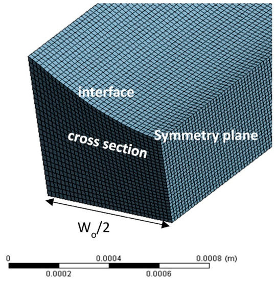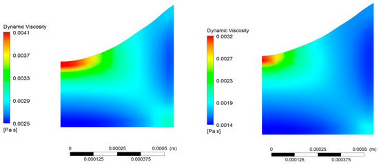 The governing equations for the fluid flow are the Navier–Stokes equations and the continuity equation for incompressible and non-Newtonian flow. The fluid domain was discretized using tetrahedral elements and a symmetry plane was used to halve the problem for lowering computational costs. Total cell number varied for every case tested; from about 180,000 to about 240,000 cells. All simulations were performed using a commercial CFD code, the ANSYS CFX® (v. 19, ANSYS Inc., Canonsburg, PA, USA). ANSYS CFX® provides a finite volume method, a fully coupled solver for pressure and velocity coupling. The Direct Numerical Simulation (DNS) method for laminar flow was employed for the solution, as the flow in the μ-channel does not present any turbulent phenomena. Figure 8, shows the dynamic viscosity distribution at cross section, which was placed 100 widths downstream from the inlet to minimize inlet disturbances.