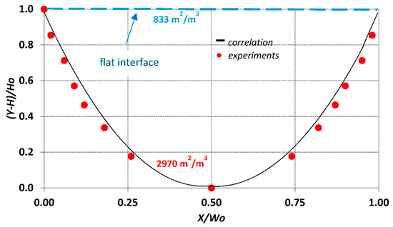 Comparison of specific surface between the flat interface and the meniscus shape calculated by the proposed correlation Equation (6) for nW, 40 mL/h, 25°.