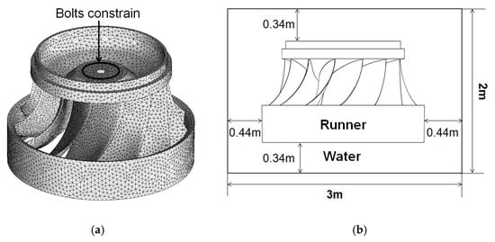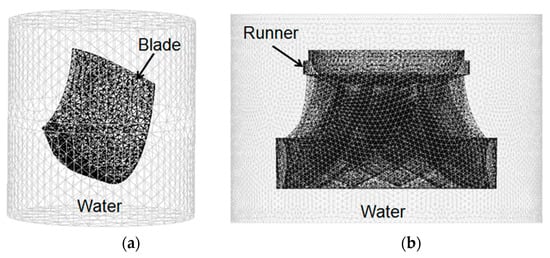 The single blade and the whole runner structure domains are built with high order tetrahedral structural elements that are suitable for modelling complex geometries. The fluid domains comprising the cavities and surrounding water have been meshed with tetrahedral acoustic elements, which are also typically used to solve fluid–structure coupling problems.