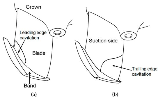 3]. The typical blade-attached forms of cavitation in a Francis runner are leading edge cavitation (LEC) and trailing edge cavitation (TEC). LEC appears on the suction side of runner blades due to operation at a higher head than the machine design head when the incidence angle of the inlet flow is positive and largely deviated from the design value. TEC appears as separated bubbles attached to the blade suction side, located near the mid-chord next to the trailing edge. These travelling bubbles appear due to a low plant cavitation number reaching their maximum when the machine operates in overload condition with the highest flow rate.