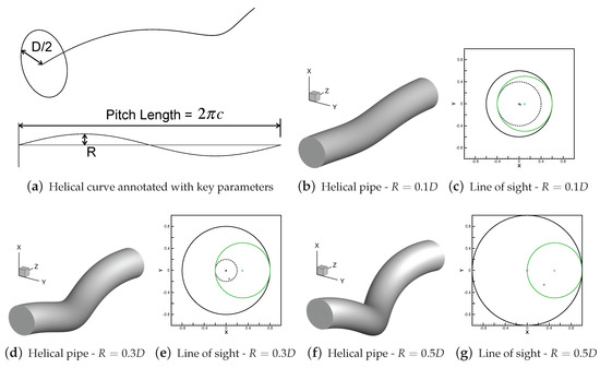 where are Cartesian coordinates. The radius or amplitude of the helical curve is denoted R, and represents the radius of the circle that the helix traces out when projected onto a plane of constant z. The wavelength, or pitch length, of the helical curve is set by the parameter c, such that one pitch length is . Forming a pipe around this centreline introduces another parameter, the internal radius , shown in Figure 2a. Subsequent dimensions will be presented as multiples of this diameter, D. In this study only small-amplitude helical geometries will be considered, with —this generates geometries that possess an axial line-of-sight down the pipe that disappears when . The concept of line-of-sight is shown in Figure 2c–g—as the helical radius is increased, the line-of-sight region, indicated by the dashed circle, shrinks. These configurations are in contrast to the large amplitude, small pitch helices used as coiled springs.