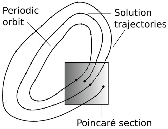 A Poincaré section is formed by taking intersections of a system’s solution trajectories after each iteration/period of the flow. Here a periodic orbit sees a solution return to the same point after each iteration. By contrast, another trajectory, initially starting close to this periodic point moves throughout the domain.