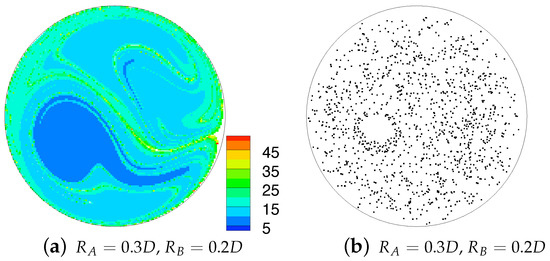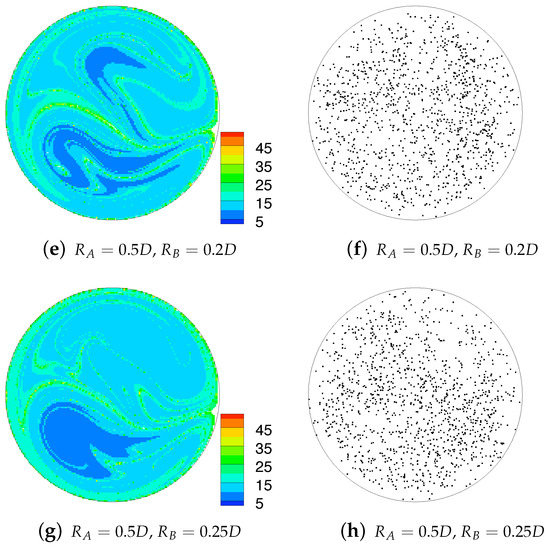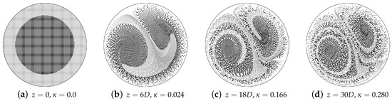 In their study, Jones et al. [28] varied both (the twist angle) and (the velocity magnitude), finding that for a fixed value of , increasing produces chaotic trajectories in a greater portion of the cross-section, with the greatest fraction of chaotic trajectories occurring when (Figure 1b). As was increased beyond this, an increasing number of islands of regular flow formed in the cross-section, thus reducing the proportion of chaotic trajectories. For small values of the chaotic trajectories exist mainly near the boundary, and in a narrow band across the horizontal diameter, with the large overlap of the Dean vortex streamlines creating the large islands of regular flow.