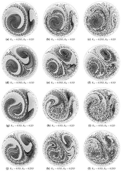 Figure 6 shows particle trajectory slices at two, four, and six pitch lengths (i.e., , , and respectively) for four different combined geometries, generated using the idealised prediction. These images demonstrate qualitatively the improvements in mixing that arise when varying the helical radius in an alternating sequence. However, it is clear from Figure 6a–f that when the difference in the velocity fields between the two geometries is not large, such as for [ and ] and [ and ], then the underlying vortical structures remain somewhat visible in the particle trajectory plots (though slightly less obvious than for the single helical pipe in Figure 5). When the velocity fields do differ more, for example by angle of vortical dividing line and/or vortical structure asymmetry, as for [ and ] and [ and ], the vortical structures that exist in each of the helical pipes used in the combined geometry no longer remain visible in these particle plots, as Figure 6g–l demonstrate.