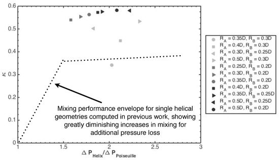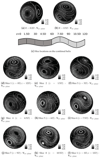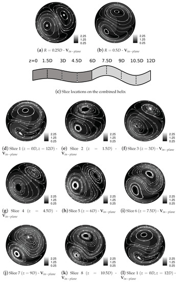 The velocity fields for the combined geometries, shown in Figure 13 and Figure 14, show some variation from the single helix solutions for at least half of the axial distance. However, the velocity fields do approach tend to the single helix solutions at 75–100% of the geometry, i.e., and , as appropriate. However, the pressure drop appears to be well predicted, and with sufficient accuracy for it to be used as a basis for design decisions, particularly with the knowledge that the bigger the difference between component velocity fields, the larger the error will be, in both the pressure loss and . However, these results demonstrate that a strict discontinuity between velocity fields is not necessary for generating the mixing, that even a gradual change between two different flow states is sufficient.