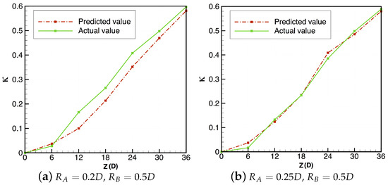 Normalised pressure losses , at , calculated by solving the velocity field in the full combined geometry, compared with the predicted loss, calculated by simply summing the normalised pressure losses from the component velocity fields (see Section 4.1).