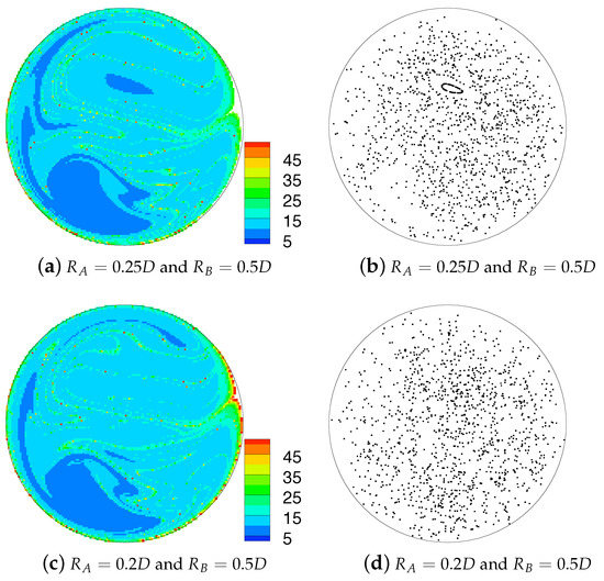 Residence time colour scatter plot (left) and Poincaré sections (right) obtained from particle tracking performed on the velocity field directly computed over the entire combined geometries. A correspondence in structures between the two plots can be observed for and in (a,b).