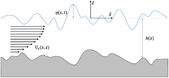 In the case of waves propagating under the additional effects of steady currents, the flow variables are split in two components: (i) the wave part , and (ii) the steady background current . We furthermore assume that the variation of the current flow is smaller than the corresponding wave flow and that . Using the above decomposition in Equation (19) and retaining terms to the lowest order [25], these equations are put in the form