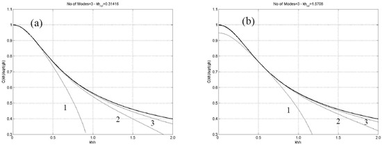 Results are presented in Figure 2 for values of the nondimensional wavenumber from 0 to 2π, ranging from very shallow to deep wave conditions, and using two values of the parameter controlling the vertical basis: . A rapid convergence of results to the analytical solution is observed, shown by using thick lines, as the modes included in the present series increases. We also observe in Figure 2 that the present representation, keeping only the first term (n = 0) in the expansion, provides excellent results over a bandwidth of non-dimensional wavenumbers around the selected value of the parameter , indicating that a simplified model based on a single-term approximation of the flow velocity is able to provide good results with appropriate selection of parameter .