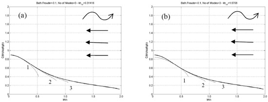 Dispersion characteristics of the linearized CMS in the case of waves and opposing parallel current Fh = 0.1 in constant depth strip, using one term (n = 0, indicated by 1), two terms (n = 0, 1, indicated by 2), and three terms (n = 0, 1, 2, indicated by 3) in the local mode expansions; (a) μ0h = 0.1π, (b) μ0h = 0.5π.