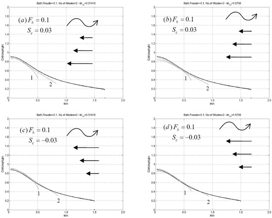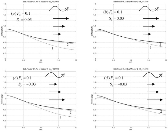 Dispersion characteristics of the linearized CMS in the case of waves and following shear current with constant vorticity in constant depth strip, using one term (n = 0, indicated by 1), and two terms (n = 0,1, indicated by 2) in the local mode expansions; (a,c) μ0h = 0.1π, (b,d): μ0h = 0.5π. The specific values of Fh and Sc are included in the subplots.