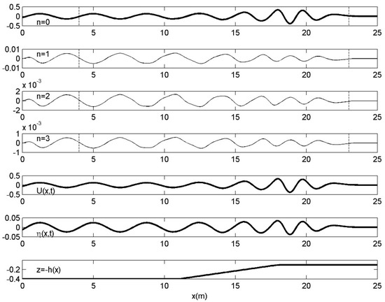 An example concerning harmonic incident waves of period T = 2 s and a height of 5 cm propagating over a linear upslope with decreasing depth from = 0.4 m to = 0.1 m, presenting a bottom slope of 4.5% is presented in Figure 7. The calculated modes at a given time instant are plotted along with the velocity field and the free surface elevation at the same instant, as obtained by the present linearized CMS, using . Using the results presented in Appendix B concerning the rate decay of the mode amplitude, Equations (A4) and (A5), in conjunction with the fact that all modes (n > 0) follow the phase of the propagating mode (n = 0) as it can be also observed in Figure 7, the following trend is expected to be valid: The latter result has been used in the discussion concerning the convergence of the present modal expansion in Section 2.