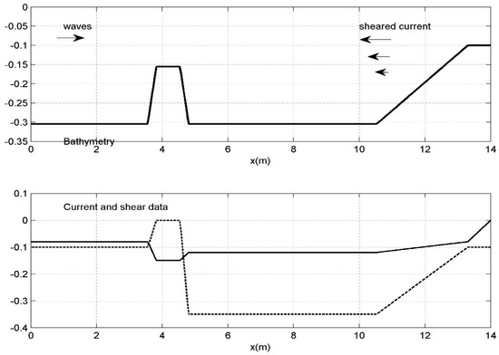 As a second example, we consider the case of normal incident waves propagating over a trapezoidal bar, seated on a flat horizontal bottom in the presence of an opposing vertically sheared current, which is presented and discussed in Belibassakis et al. [17]. In this case, experiments have also been carried out in the wave flume at SeaTech, University of Toulon, France. At the upwave end of the channel, an electromagnetic piston generates regular waves by horizontal motion. Also, at the downwave end, a sloping beach is used to absorb waves. An opposing current is injected in the channel by a hydraulic pump and a perforated screen is used to control the shear. The opposing current is adjusted to generate flow profiles that are linear in depth , where is the surface current and the shear, and thus, in this specific case the vorticity is . In the experiments, the water depth was 0.305 m, and the incident wave frequencies were ranging from 0.65 Hz to 1.3 Hz with amplitudes between 1–2 cm ensuring small wave steepness, both without and with the vertically sheared current. The distributions of the bathymetry, as well as the surface current and shear data, are presented in Figure 8.