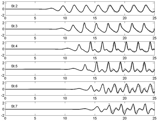 Comparison of present simplified nonlinear model results in the case of monochromatic waves of period T = 2 s propagating over the trapezoidal bar of Figure 9 against the experimental data by Beji and Battjes [27], shown by using dotted lines. Time series of free surface elevation measured at stations 2–7 of Figure 9.