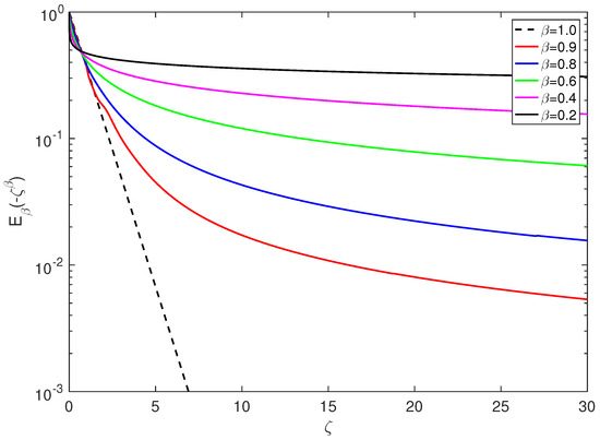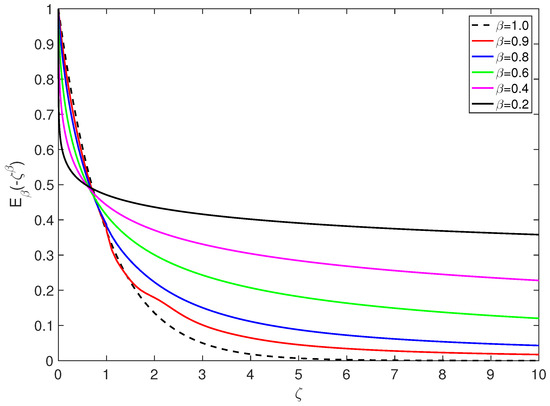 The solution of this linear fractional differential equation for is given by the Mittag-Leffler functions [4,36,50,52], with the dimensionless variable defined via , that is
