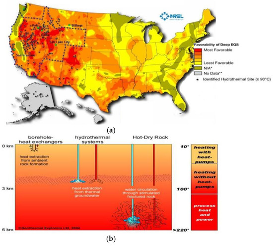 Geothermal resource distribution and geothermal resource extraction methods. (a) Geothermal resource map of the United States (Reproduced with permission from [8]), with the dotted region outlining identified hydrothermal sites. Color coding classifies favorability to enhanced geothermal systems (EGS) systems. (b) Relative depth and temperature range (°C) of different heat extraction methods (Reproduced with permission from [9]).