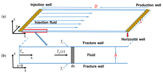 Schematic of abandoned hydrocarbon horizontal well system in terms of the corresponding physical model. (a) System comprises two horizontal wells connected by a single fracture plane. (b) Zoom in of the heat flow model within the fracture channel.