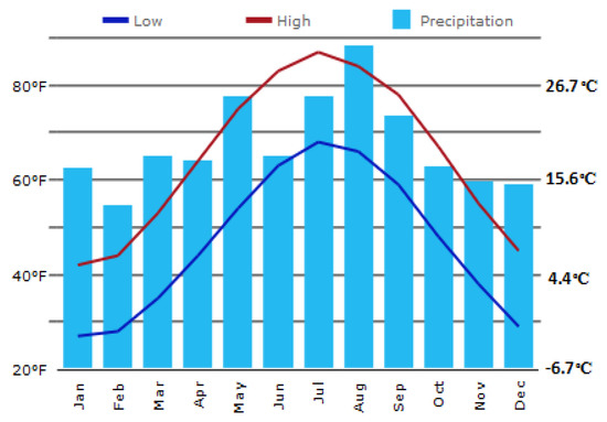 Texas climograph data in 2016. The blue line is the average low temperature of each month, and the red line is the average high temperature of each month. The blue bars give the relative average monthly precipitation (Reproduced with permission from [39]).