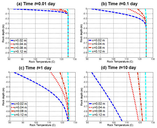 Cooling profile of the host rock at four locations (x = [0.02, 0.04, 0.08, 0.12] (m)) for different times. (a) t = 0.01 day; (b) t = 0.1 day; (c) t = 1 day; (d) t = 10 days. Initial rock temperature is 125 °C. Fracture aperture is 0.005 m. Brine velocity is 0.001 m/s. The initial fracture wall temperature for time 0 is defined when first fresh injected fluid batch passes by. For example, for x = 0.002 m, the reference time is 0.02/0.001 = 20 s.