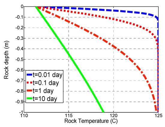 - Thermal conduction in the rock interior adjacent to the fracture wall cooled by the circulating brine is analytically solved (Equation (12)), which gives the rock temperature profile versus rock depth.