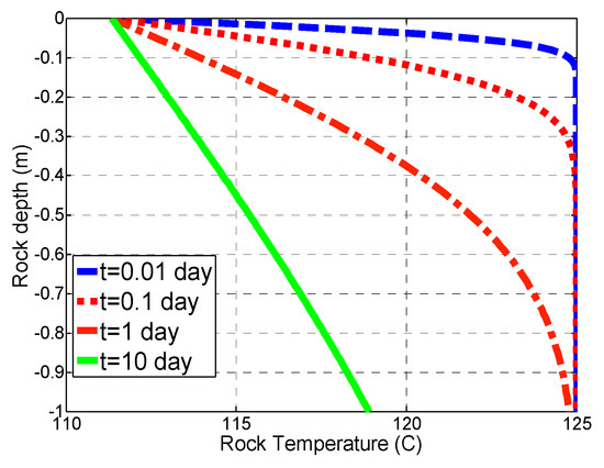 At a certain time, t, the temperature, T, at the fracture surface located at depth z = 0, is specified using a simplified version of Equation (2):