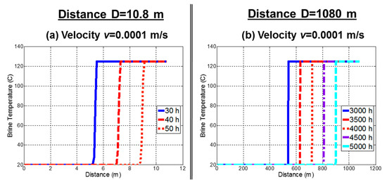 The mutual influence between the cold brine and hot fracture wall was considered (Mechanism 3), and the temperature profile of injection brine is plotted in Figure 14 for three different velocities, both for the shorter travel distance D = 10.8 m and longer travel distance D = 1080 m. The brine temperature profiles are different for different time steps, because of the gradual decline in the temperature of the fracture wall. For faster circulation velocities, the heat stored in the fracture wall will vanish faster. The disappearance time varies from 147 days at velocity v = 0.0001 m/s to 15 h at velocity v = 0.0368 m/s.