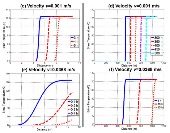 Brine temperature profile in the “tracer” perspective. Three different velocities are chosen. (a,b) v = 0.0001 m/s, (c,d) 0.001 m/s, and (e,f) 0.0368 m/s. Running distances are set to be the short distance D = 10.8 m and the longer distance D = 1080 m.