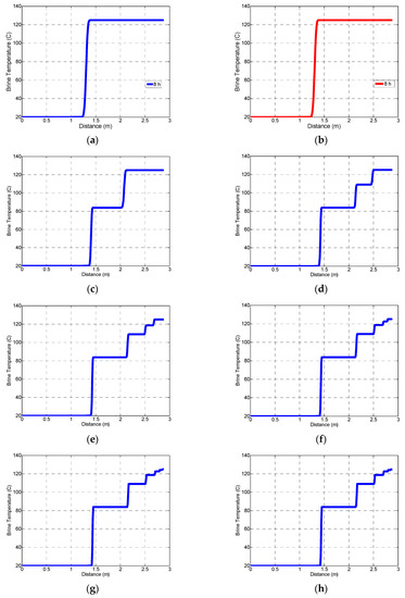 At t = 8 h, the brine temperature and fracture wall temperature will develop the profiles shown in Figure 16a,b after applying Mechanism 3. The periodic circulation plan is repeated for day 2 until day 7 and the corresponding results are plotted in Figure 16c–h. Comparing Figure 16a–h, it is seen that the brine temperature profiles are converging to a quasi-steady state. In fact, comparing Figure 16a,c, we see that Figure 16a has two step temperatures, 20 °C and the final temperature, 125 °C, but Figure 16c has one more step temperature, which is about 85 °C and 0.7 m long. The extra step temperature is caused by the partial recovery of the fracture wall surface temperature during the 16 h recovery on the first day. The brine temperature will still be heated up to 125 °C at the end of 8 h on day 2 (Figure 16c). On day 3 (Figure 16d), another step temperature (about 110 °C) shows up in the brine temperature profile but with shorter length (0.35 m). As the production schedule continues until day 7, the same results keep showing up but the lengths of these new steps are converging to 0. The difference between Figure 16g,h is already unrecognizable in the figure scale. On day 7 (Figure 16h), the brine temperature is very close to the quasi-steady state.