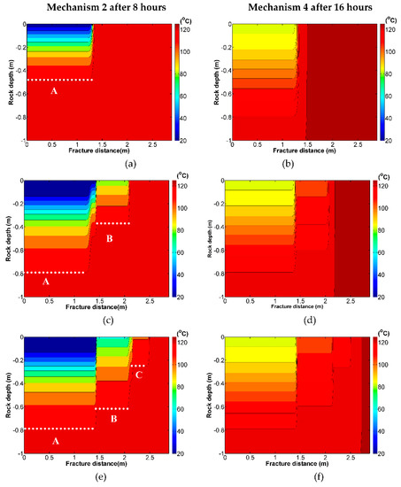This periodic circulation is repeated for day 2 to day 7, with 8 h circulation and 16 h pumps switched off, every day. The results are shown in Figure 17c–n. On day 2, after 8 h circulation, the cooling profile of the rock evolves further to x = 2 m, where the fracture wall temperature has decreased to about 80 °C. Then, after 16 h recovery in Figure 17d, the fracture rock temperature recovers, but only to 125 °C at about x = 2.15 m. On day 3, the cooled fracture portion advances further to about x = 2.5 m, but the cooling speed is slowed down. The same phenomena continue on day 4 to day 7, which leads to the quasi-steady state on day 7. The quasi-steady state distance is about x = 3 m (Figure 16h), which means for locations further than x = 3 m, the rock temperature will be always the initial rock temperature, 125 °C. The evolution of the separation lines A, B, C, and D shown in Figure 17 (left column) illustrates the convergence of the temperature profile to the quasi-steady state.