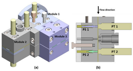 A double slit rheometrical die for in-process characterization, recently developed by the authors [15], was modified and used in this study. It includes three modules: a central body (module 1) where the inlet circular channel from the extruder is progressively converted into a slit, which is then divided into perpendicular measurement (module 2) and extrusion (module 3) channels. The flow rate in the measuring slit is varied by a valve positioned at its entrance, whereas a second valve balances the flow rate in the extrusion slit to keep a constant pressure at the die inlet. Thus, rheometrical measurements can be performed while maintaining constant extrusion conditions (feed rate and screw speed). The initial design, construction, and rheological validation have been reported elsewhere [15]. For the present study, a new measurement channel (module 2) was developed. The new module comprises two halves bolted together. In one part, three conventional melt pressure transducers flush mounted can be inserted, while in the other part three piezoelectric transducers can be also flush mounted at the same axial position, see Figure 1. The measurement channel presents a cross section of 10 mm width by 0.8 mm height.
