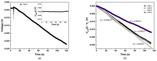 Figure 3 presents the time evolution of the voltage V acquired by transducer PS 1 mounted in an empty slit (no pressure applied), in order to assess the drift inherent to this measuring system. In Figure 3a, the effect of switching on the amplifier on the recorded voltage is evident: the signal jumps to a value V0 before drifting with time. As expected [5], the signal presents a drift that follows Equation (1). Thus, the voltage can be corrected to give a flat signal Vcor(t) = V(t) − Vdrift(t), as shown in the inset to Figure 3a. Both jump to V0 and drift are due to the closing of the electronic circuit (both amplification and pressure sensing), and as such should be independent of the pressure and temperature at the tip of the sensor [19].