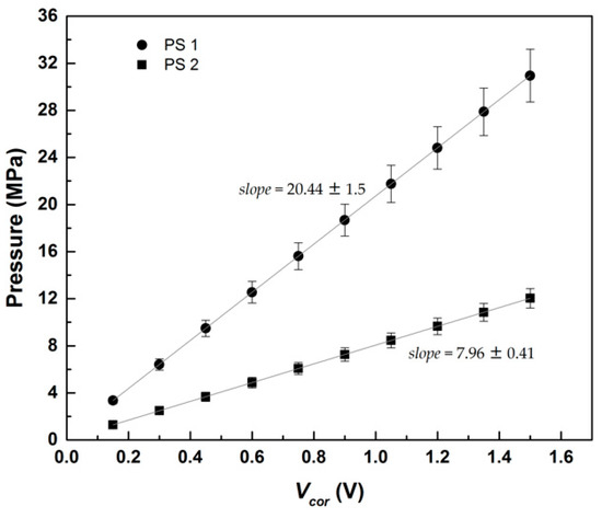 Figure 5 represents the calibration curves for PS 1 and PS 2. Each data point and error bar result respectively from the average and standard error of five measurements similar to the one displayed in Figure 4. The slopes returned by the linear fits to the data indicate that the response of the piezoelectric sensors is nicely linear for the range of pressures tested. In addition, the computed slopes do not significantly differ from the constants calculated with the sensibilities reported in the calibration certificate supplied by the manufacturer, namely 50/x = 20 for PS 1 and 50/x = 7.58 for PS 2 (see Table 1 for x). The intercepts to the origin for the linear fits are 0.28 ± 0.03 and 0.096 ± 0.001 for PS1 and PS2, respectively. These intercepts are smaller than those found for the conventional transducers (0.415 ± 0.015), which suggest a better sensitivity for piezoelectric sensors in the low-pressure range.