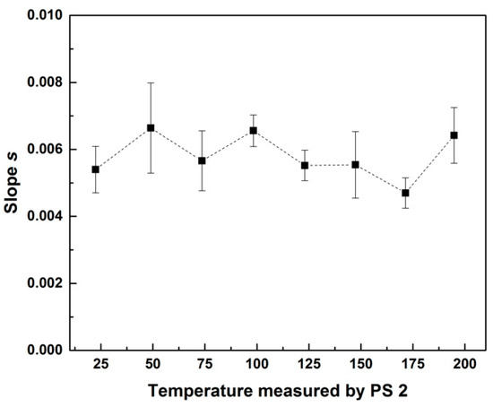 In order to estimate the eventual effect of the melt temperature on Vdrift, experiments were performed with the piezoelectric transducers mounted on the heated double slit die, but with no material in the slit cavity. Figure 6 reports the temperature dependence of the slope s computed using Equation (1) from Vdrift transients recorded with PS 2.