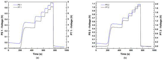 Time evolution of outputs (voltages) measured during the stepwise ramp in the piston velocity of the capillary rheometer fed with a low density polyethylene (LDPE) at 150 °C. (a)—Piezoelectric (PS 1) and conventional (PT 1) transducers located upstream. (b)—Piezoelectric (PS 2) and conventional (PT 2) transducers located downstream.