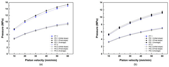 Comparison between the pressures obtained with the piezoelectric sensors and conventional transducers for each piston velocity. (a) LDPE at 150 °C. (b) LDPE at 180 °C. Initial slope and final slope refer to the values of s used in the fitting of Vdrift before actuating the piston or at the end of the ramp in piston’s velocity. Average indicates that drift correction is performed by computing the average of initial and final slopes s.