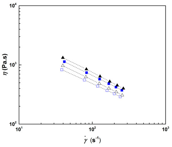 The data with the average slope method for drift correction displayed in Figure 8 were inserted in Equations (3)–(5) to compute the flow curves shown in Figure 9. The impact of the mismatch between the pressure readings of both type of transducers on the resulting flow curves is evident in Figure 9. The pressure mismatch produces a vertical shift between the flow curves, the differences between the measured viscosities being larger at smaller shear rates than at larger shear rates. Nonetheless, the discrepancy between the measured viscosities remains in the range 5.6% to 10% (see also Table 2), which can be assumed as acceptable if one considers the 10% experimental error usually reported for rotational rheometry [21] and recently confirmed with Newtonian viscosity standards [22] and with a low density polyethylene studied at 150 °C [14].