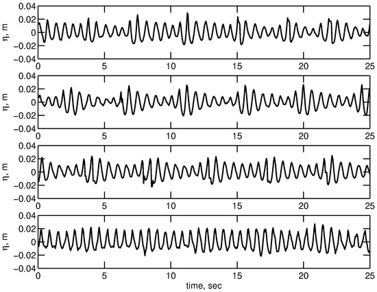 Time series of surface elevations measured at the second wave probe, Hz. (top panel) . (second top panel) . (second bottom panel) . (bottom panel) . The waves propagate from right to left. Reproduced from [10].