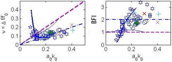 Bandwidth (left panel) and modulational index (right panel) versus steepness . Circles indicate waves with Hz, crosses with Hz, pluses with Hz. Diamond is the [12] point and triangle the [14] point. Pentagrams and hexagrams are from the additional experiments in the tanks of UT and NCKU, respectively. All data, except filled circles, are for no wind forcing. Squares and thick solid lines (blue) correspond to parameterisations of the field spectra of wind-generated waves (JONSWAP, [29] and DHH, [28] respectively). The dash-dotted line (blue) is . The small-amplitude theory of [1] for the fastest-growing instability is shown with dashed lines (magenta), and the high-order-non-linearity theory of [4] with thin solid lines (blue) (following [14]).