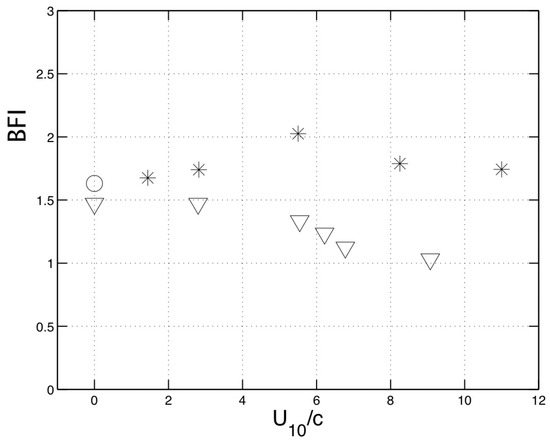 Behaviour of the modulation in the presence of wind requires special attention. On one hand, even under extreme wind forcing, the data points in Figure 3 are not distinguishable from their unforced counterparts. Dependence of as a function of wind forcing is plotted in Figure 4 where both data of this study and those taken from Figure 15 of [14] are shown. There is neither a noticeable trend nor consistent deviations from the no wind scenario.